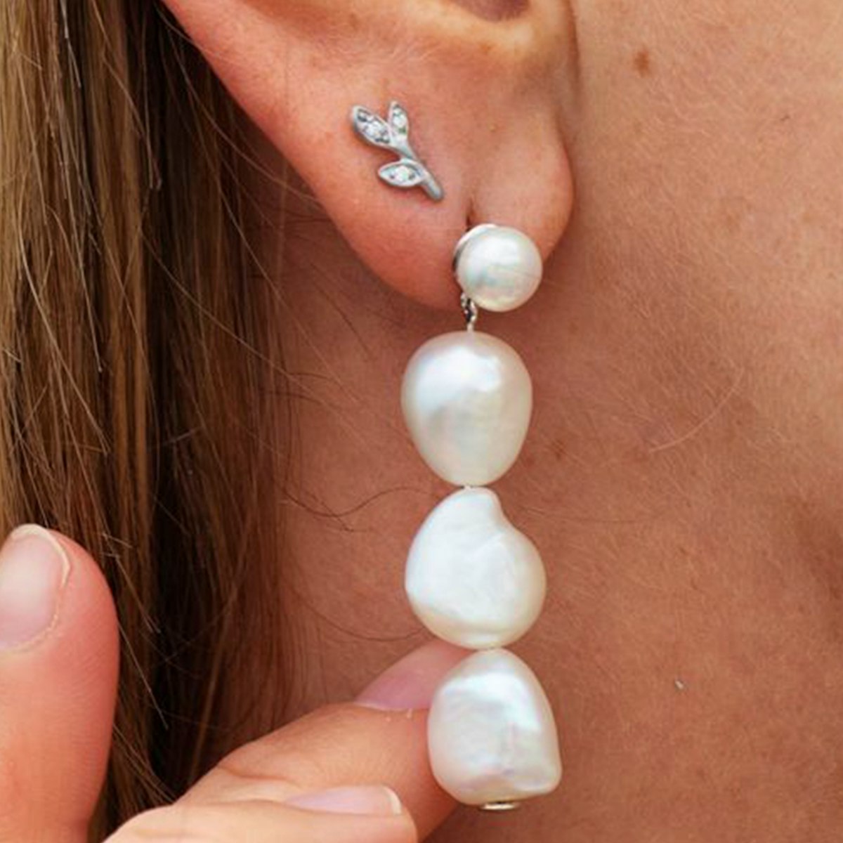 Aura Grande Show Earrings fra byBiehl er en smuk og stilfuld ørering, der bringer elegance og bevægelse til enhver anledning. Denne ørering er designet med en lille ferskvandsperle øverst, som skaber en fin og sofistikeret start. Fra den lille perle hænger tre store ferskvandsperler ned, hvilket skaber en iøjnefaldende og flydende effekt, der bevæger sig smukt med dine bevægelser.