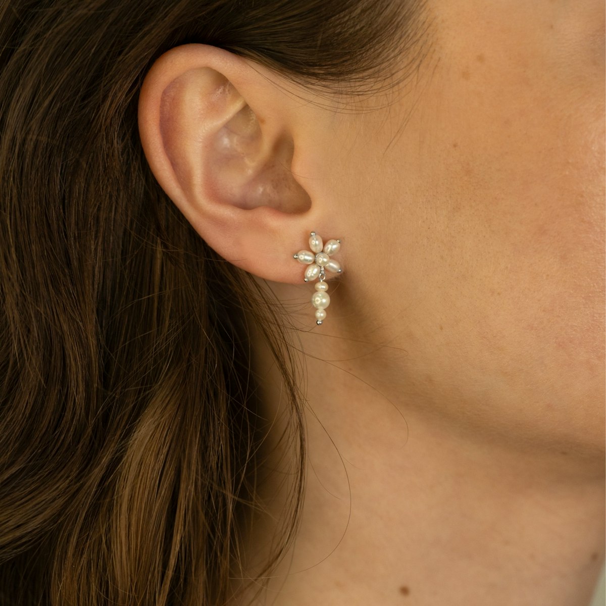 Opdag den delikate skønhed i byBiehl's Pearl Signature Earhangers Short. Disse øreringe er en fejring af klassisk elegance med deres betagende design. Hver ørering er smukt formet som en blomst af ferskvandsperler, der skaber en elegant og tidløs fremtoning. Fra blomstens centrum hænger yderligere tre ferskvandsperler, som tilfører et strejf af finesse og dybde til det samlede udtryk.