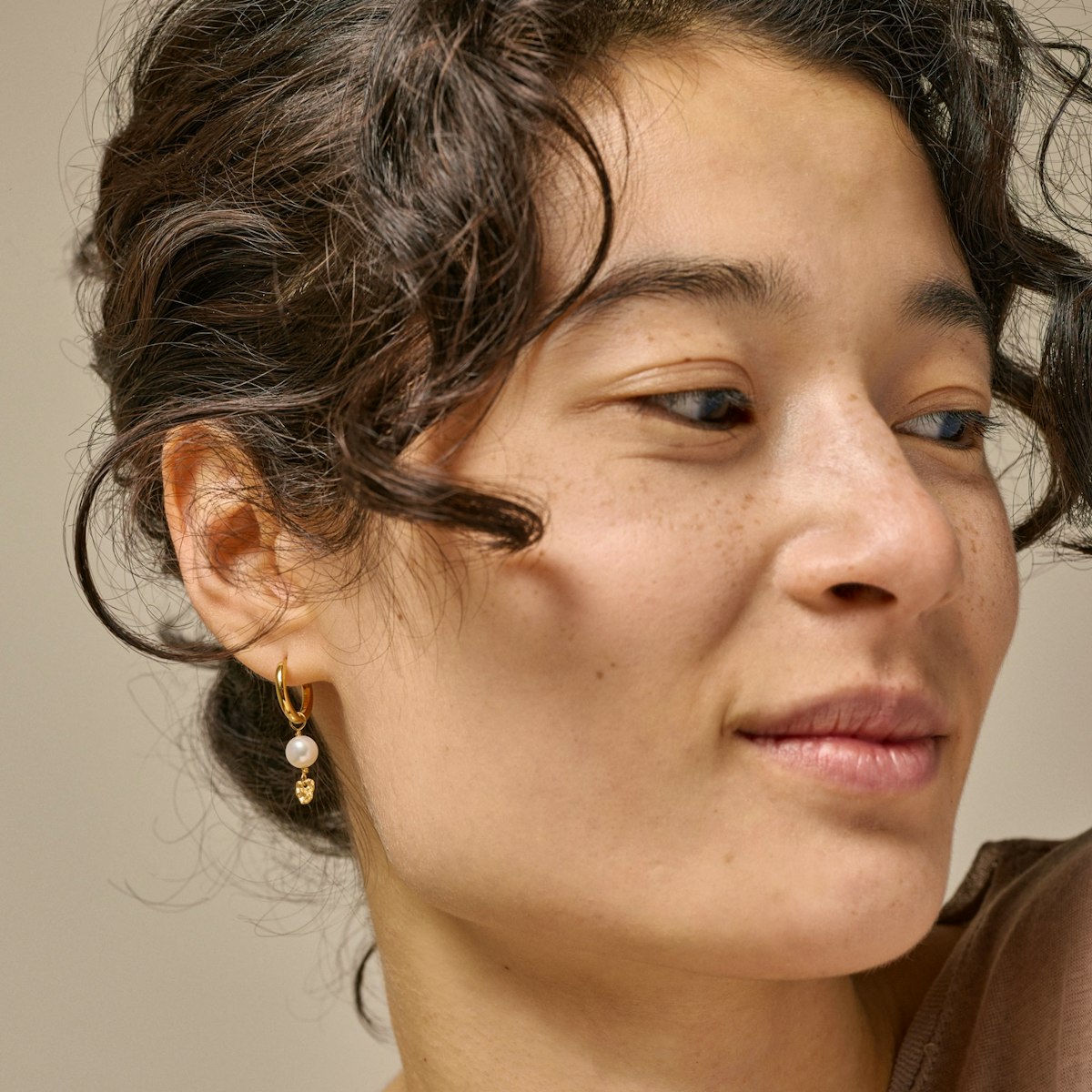 Disse Cara hoops er udført i 925 sterlingsølv og belagt med 18 karat guld. De udgør et sæt charmerende og dynamiske øreringe, beriget med naturlige detaljer og en perfekt proportioneret størrelse. Den tilhørende perlevedhæng kan nemt fjernes efter behov, hvilket giver ekstra fleksibilitet til styling. Cara-øreringene er yderst alsidige og kan let kombineres med en række små, delikate øreringe for at skabe forskellige looks.