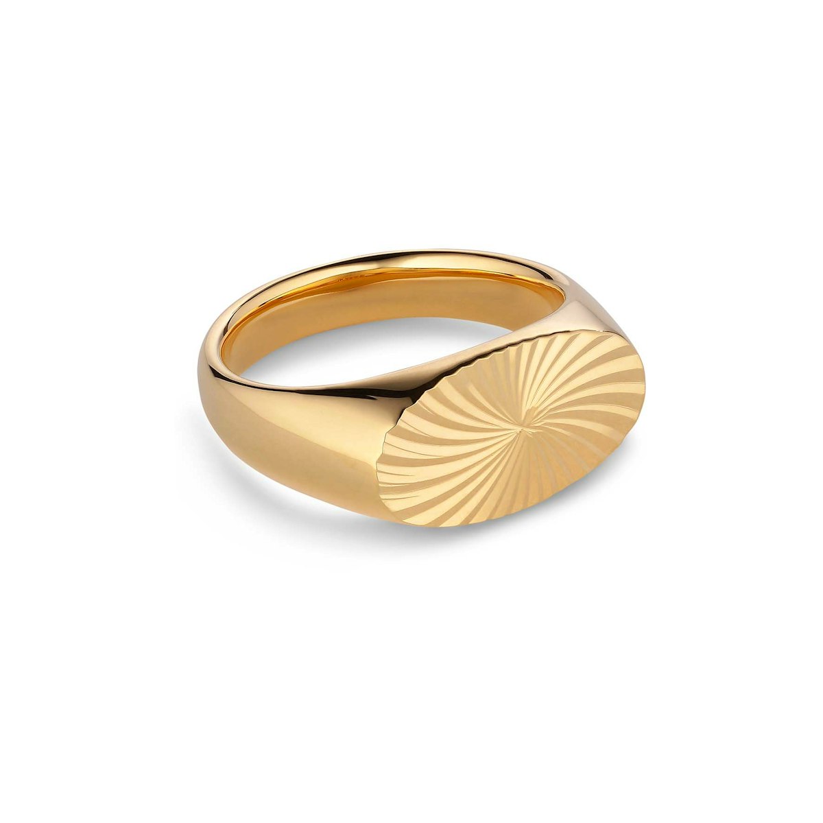 Reflection Signet Ring on saatavana 18 karaatin kullattuna hopeana ja hopeana, ja siinä on kaunis keskitetty kaiverrus sormuksen päällä.