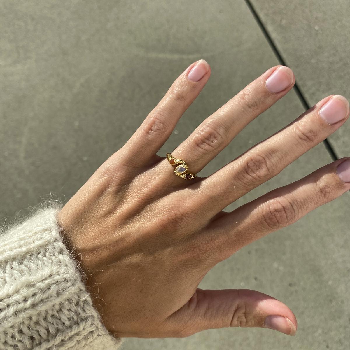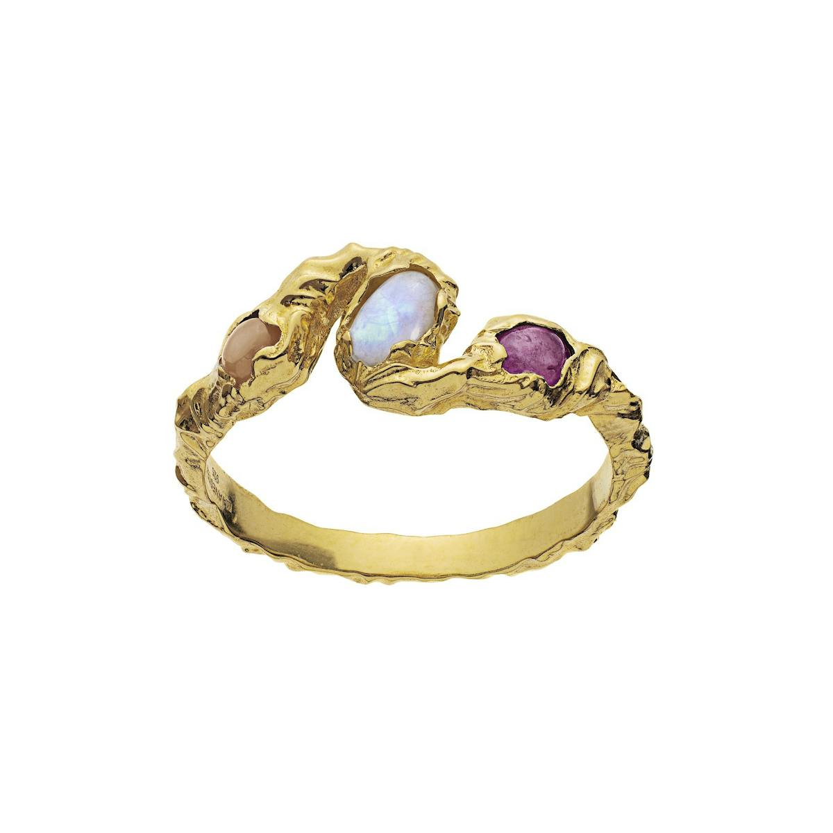 Baila-sormuksessa on kimaltelevia kiviä. Maanesten AW21-mallisto juhlistaa arjen salaperäisyyttä.