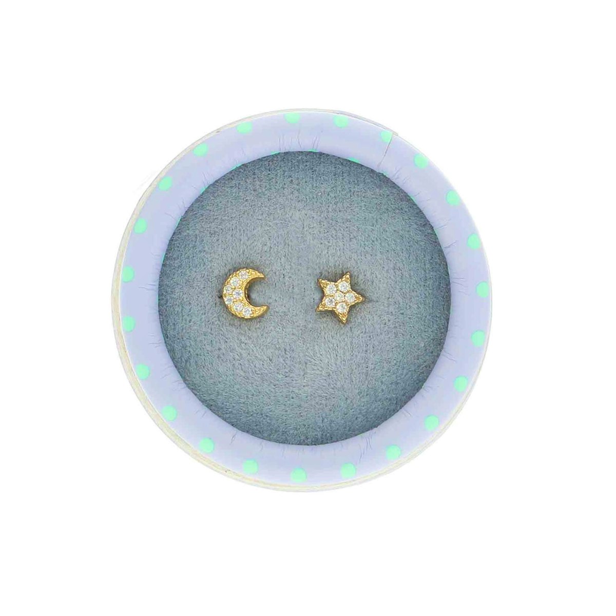 Precious White Earstick Box er en charmerende lille æske med to elegante ørestikker, som kombinerer sødme og raffinement på fineste vis. Ørestikkerne er fremstillet i 24 karat forgyldt genanvendt sterling sølv, og den høje kvalitet mærkes straks. Det ene motiv er en stjerne og det andet en måne, begge smukt dekoreret med glimtende klare zirconia, som giver et funklende og sofistikeret udtryk.