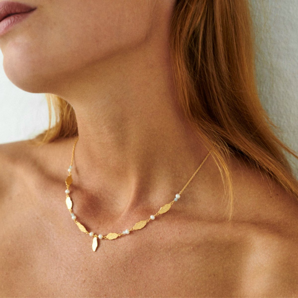 Pernille Corydonin luomassa lumoavassa Drifting Dream -kaulakorussa on kauniita riipuksia, joissa on elegantti orgaaninen muoto ja jotka on koristeltu valkoisilla helmillä ja lumoavalla akvamariinilla. Värisävyt ovat herkkiä ja lempeitä, ja ne ovat saaneet inspiraationsa leudosta keväästä. Kaulakoru on saatavana sekä hopeisena että kullattuna hopeana, ja se on valmistettu sertifioidusta kierrätyshopeasta.