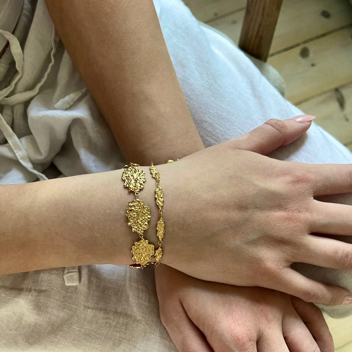 Dette armbånd er både elegant og trendy, og kombinerer de bedste elementer af moderne design med tidløs stil. Det er prydet med små, delikate banket vedhæng hele vejen rundt, som tilfører et iøjnefaldende touch til armbåndet. Denne funktion skaber en smuk tekstur, der fanger lyset på en måde, der gør armbåndet til en glitrende tilføjelse til ethvert outfit.