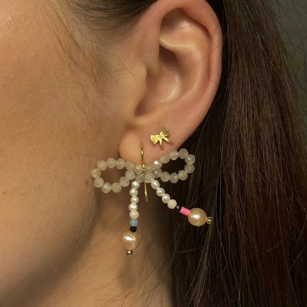 Forkæl dine ører med en overdådig elegance med disse smukke øreringe, der er prydet med et væld af perler og udformet som sløjfer. Disse øreringe er en hyldest til luksus og feminin finesse, der vil tilføje et strejf af glamour til enhver lejlighed.