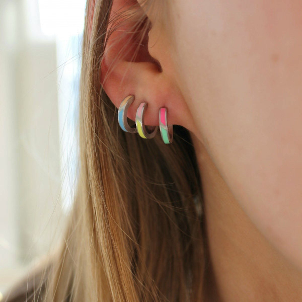 Petit Circus Huggie Earring Blue & Pale Peach Enamel er en skøn lille creol ørering med smukke emalje farver i blå og ferskenfarvet.