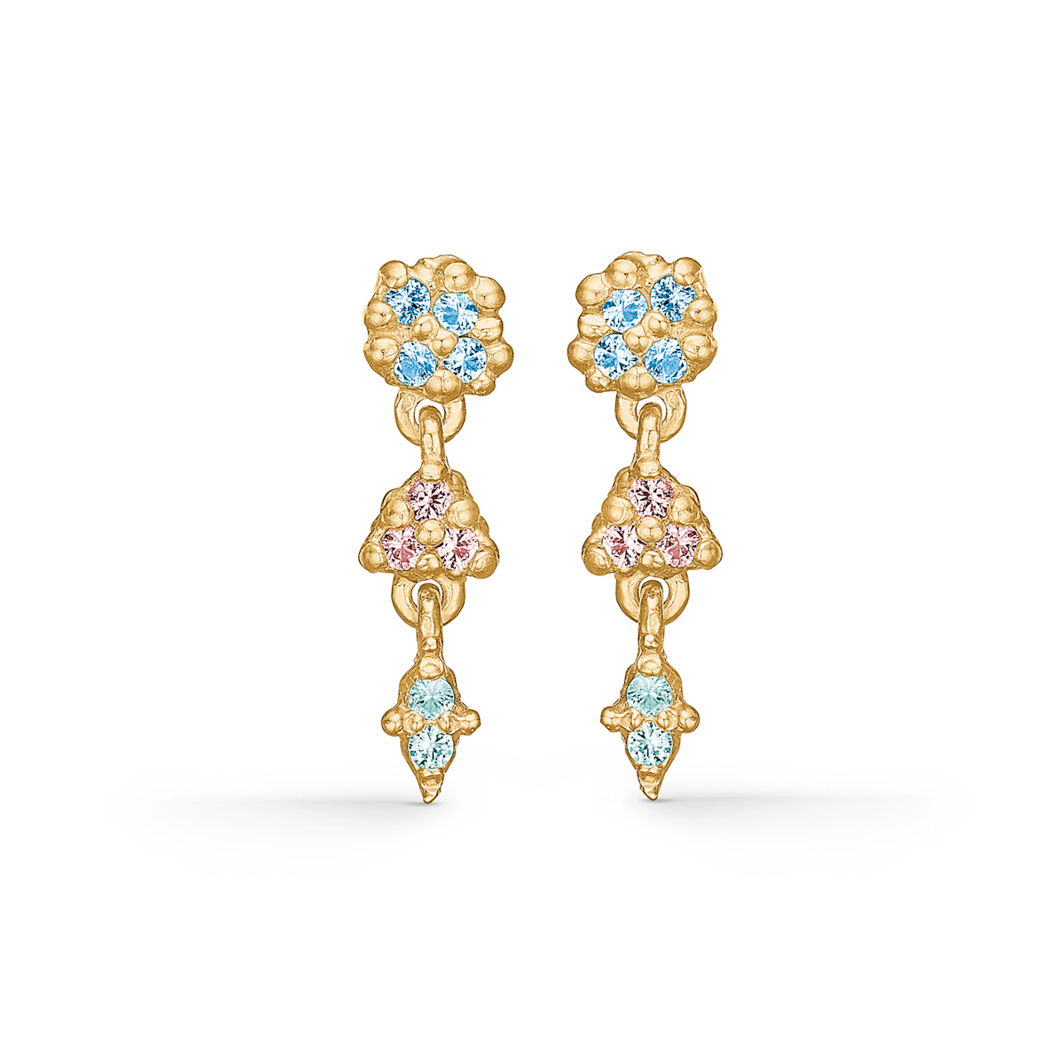 Cluster øreringene fra Studio.Z forener farverig elegance med moderne design. Med en smuk kombination af blå, grøn og rosa zirkonia skaber disse øreringe et legende og eksklusivt udtryk, der skiller sig ud – uden at overdøve. De iøjnefaldende farver er harmonisk placeret i et afrundet design, som elegant indrammes af den varme glød fra det forgyldte sølv.