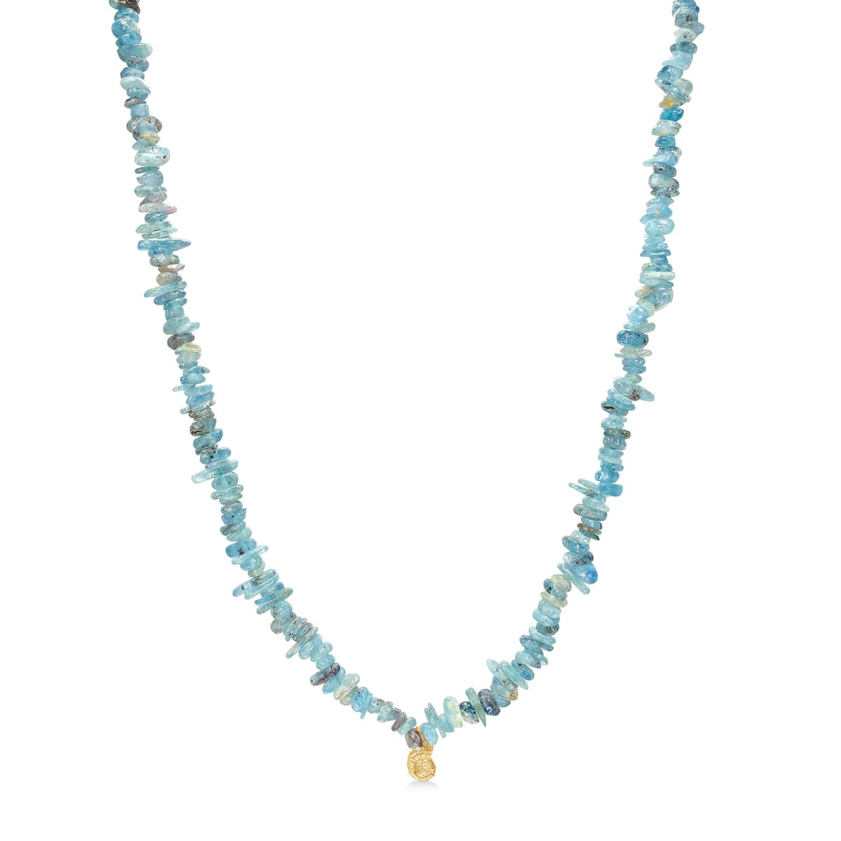 Halskæden er smukt sammensat med naturstenen kyanit – en ædelsten kendt for sin intense blå nuance og rolige energi. Kyanitens farvespil skifter med lyset og skaber et elegant, drømmende udtryk, som giver smykket liv og karakter. Da hver sten er et naturligt materiale, vil der være små variationer i farve og struktur, hvilket gør hvert smykke helt unikt.